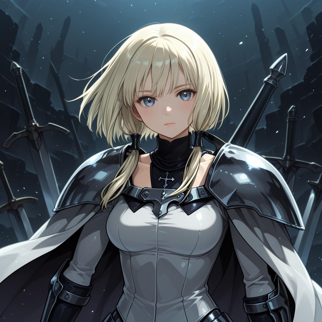 Clare (claymore), claymore (series), 1girl, grey eyes, blonde hair, short hair, armor, cape, sword, by artist heebee, dark_illustrious