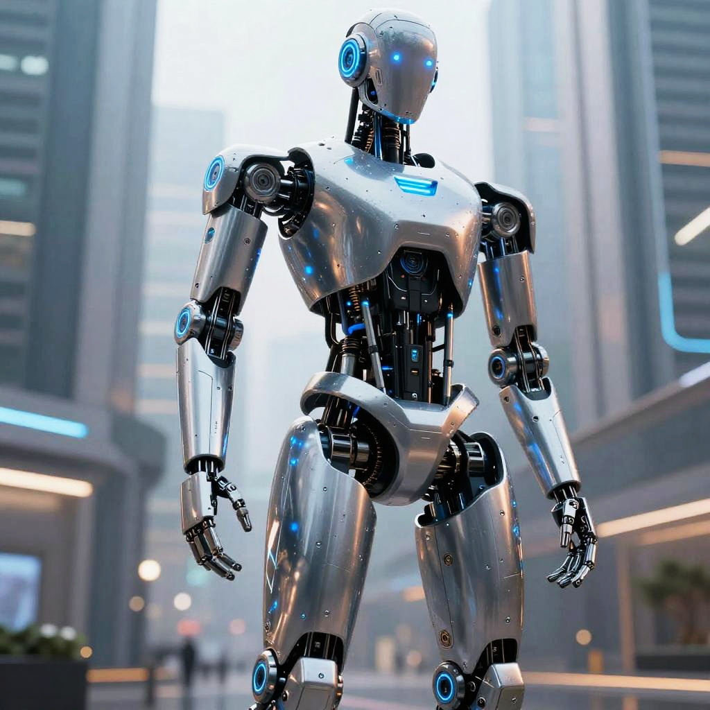 Body AI integrated humanoid robot standing in a futuristic cityscape, sleek metallic design with blue LED lights, intricate joint articulation, hyper-realistic textures, advanced robotics, dynamic lighting, reflective surfaces, cybernetic enhancements, detailed digital art style.