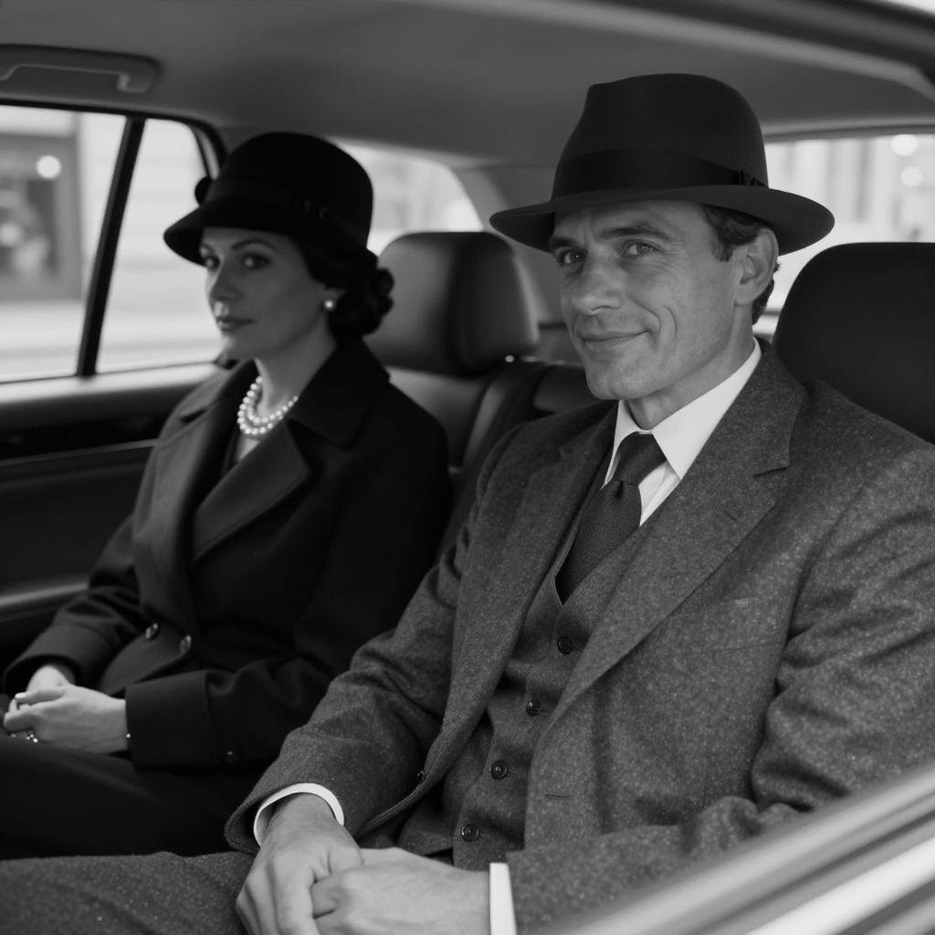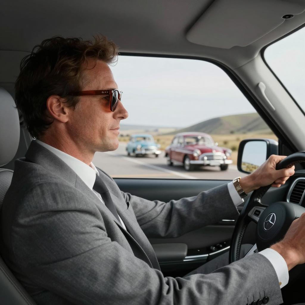 Man with brown hair, wearing brown-tinted sunglasses and gray suit, driving car, holding steering wheel with right hand. Background: road with two vintage cars, hills on the right. Clear daytime sky.