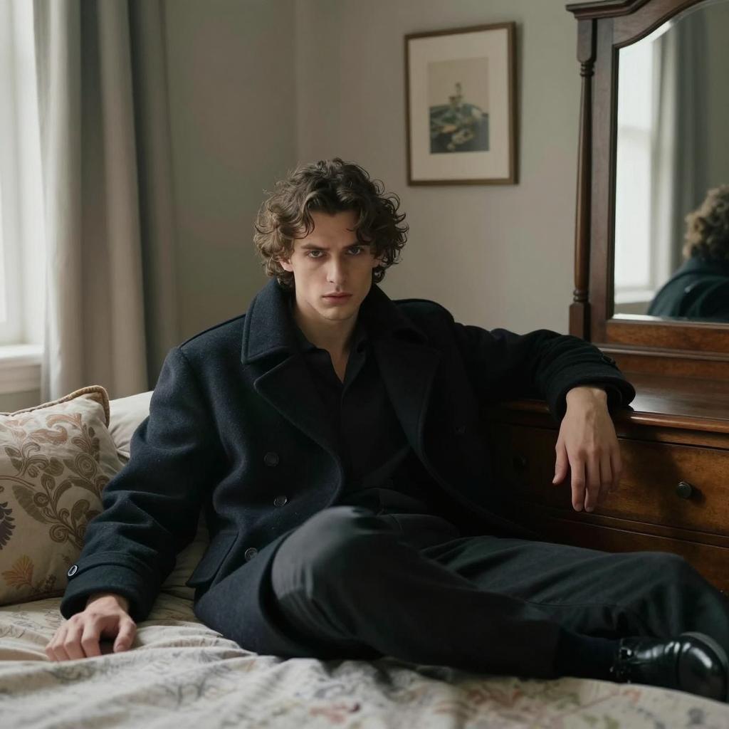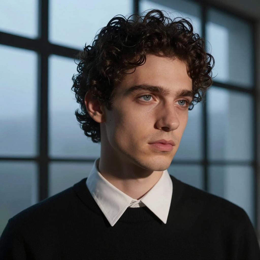Portrait of a young man with curly dark hair, light skin, and blue eyes. He is wearing a black shirt with a white collar and has a neutral expression while looking slightly to the right. The background consists of large, blue-tinted window panes, with lighting that highlights the subject's face and casts subtle shadows for a dramatic effect.