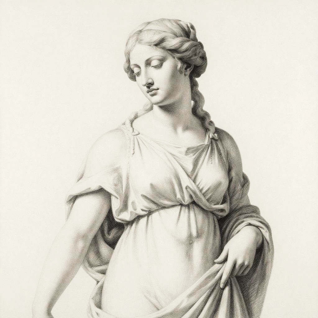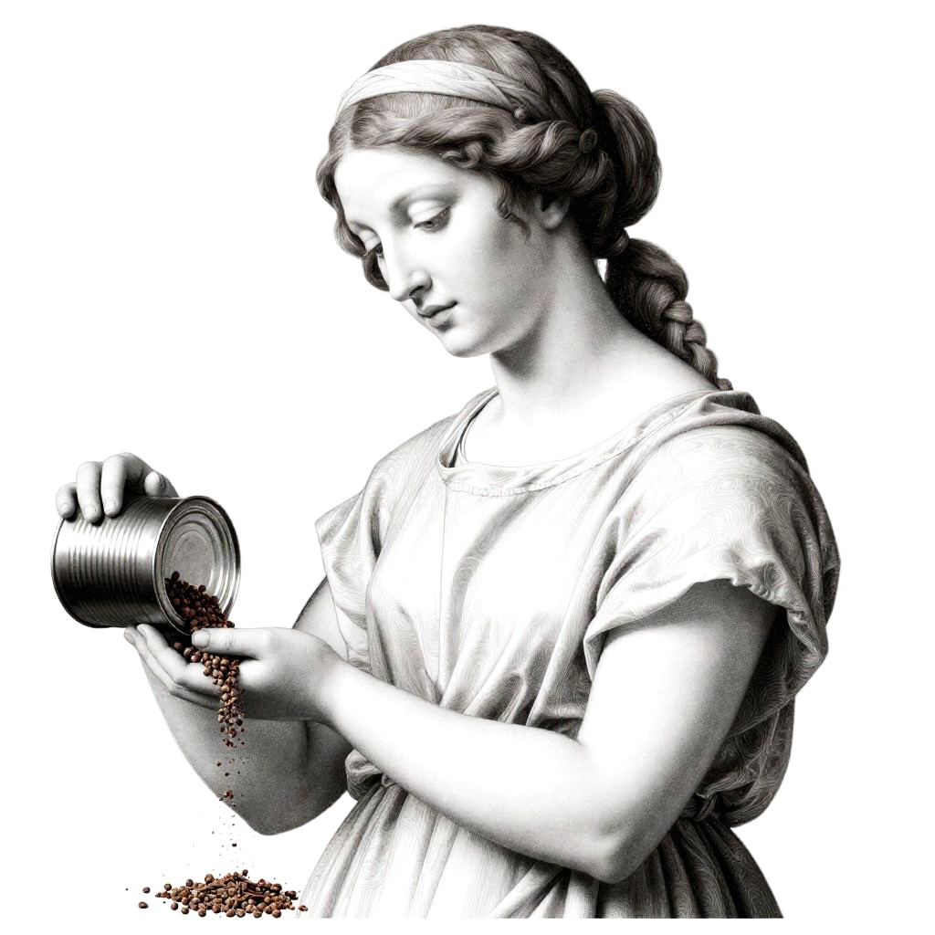 Realistic photo.Renaissance-style graphic of a woman from torso up, bent forward holding a canister with spices flowing out. No background, heavy outlines, inspired by classical art style, simple and clean realistic photo