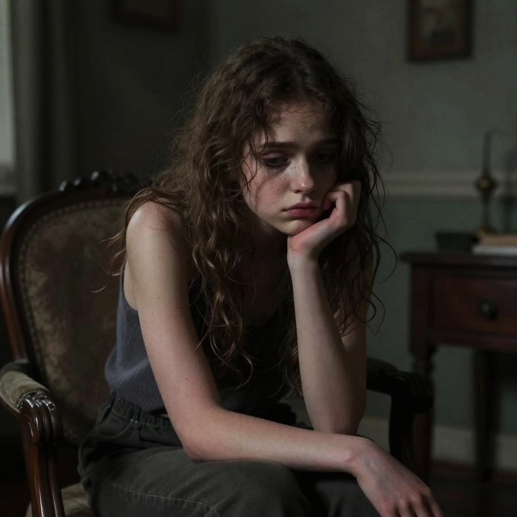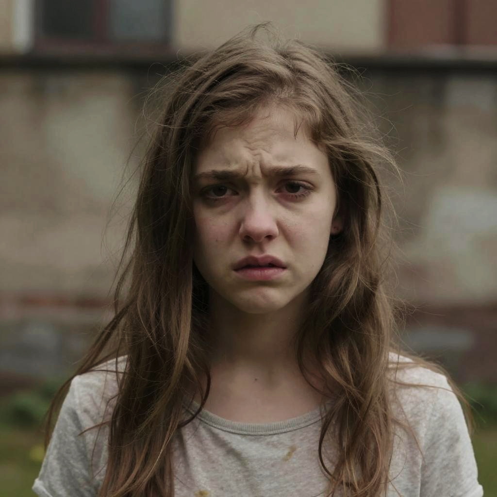 Photograph of a sad, young girl with dirty, wet brown hair, tear-streaked pale face, and pinkish eyes, standing in a