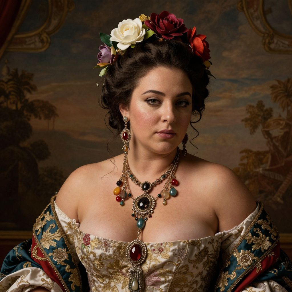 Portrait of a pulpeuses woman adorned with intricate jewelry and flowers in her hair, baroque-inspired background, warm toned palette, rich textures in fabric and skin, dramatic lighting emphasizing curves and form.