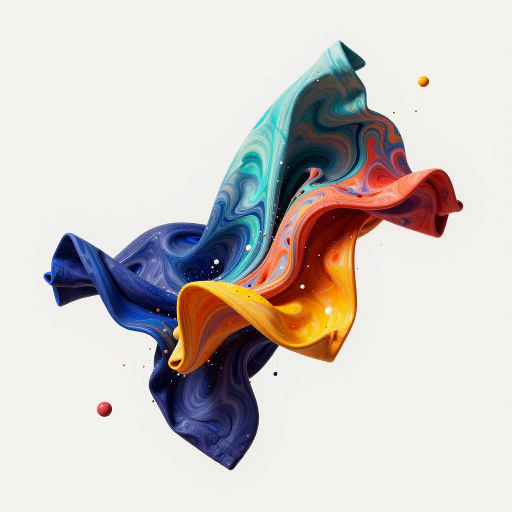 Free cloths remover abstract art, colorful fluid shapes representing fabric disintegration, dynamic motion and energy flow, contemporary digital painting style, artistic representation of transformation and freedom
