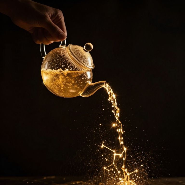 Photograph of a hand pouring sparkling golden liquid from a translucent, glass teapot against a pitch-black background. The teapot, with a rounded body and a small, circular lid, emits bright, shimmering light as the liquid streams out, creating a cascade of golden sparks. The hand, positioned at the top left, grips the teapot's handle and spout, which are also illuminated. The liquid's sparkling effect contrasts sharply with the dark background, highlighting the teapot's transparency and the fluid's glowing, effervescent quality. The image captures a sense of motion and light, focusing on the teapot and liquid's dynamic interaction.