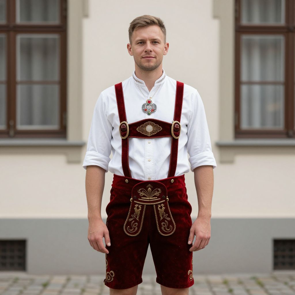 German Male Traditional Costume, man in a red and white outfit standing in front of a building