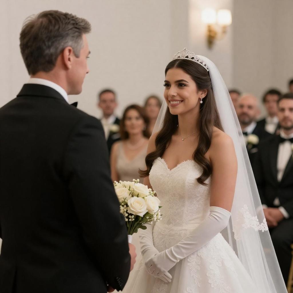 Photograph of a bride in a white strapless lace gown with a tiara, long brown hair, white gloves, and a veil, smiling at a grey-haired groom in a black suit. Background: seated guests in formal attire, looking at the couple. Bride holding bouquet, groom facing bride, intimate moment.