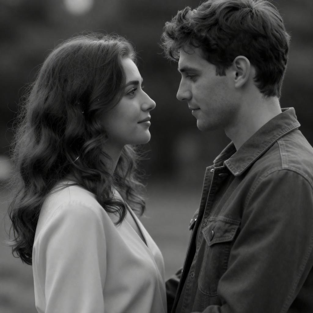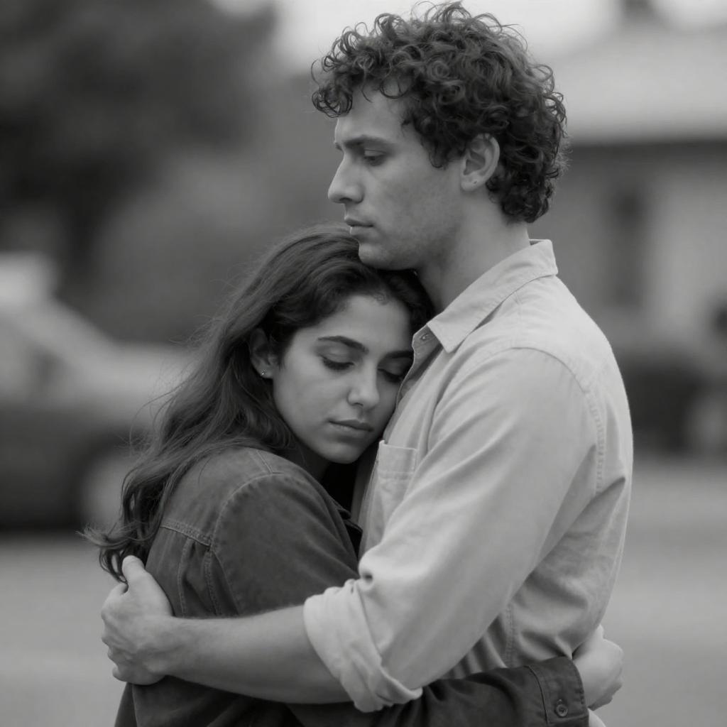 Black-and-white photograph of a man with curly hair and a woman with long hair embracing tightly. The man, wearing a light-colored shirt, stands slightly behind the woman, who wears a dark jacket. Both have serious expressions. The background is blurred, focusing attention on their emotional embrace. The woman's head rests on the man's shoulder.
