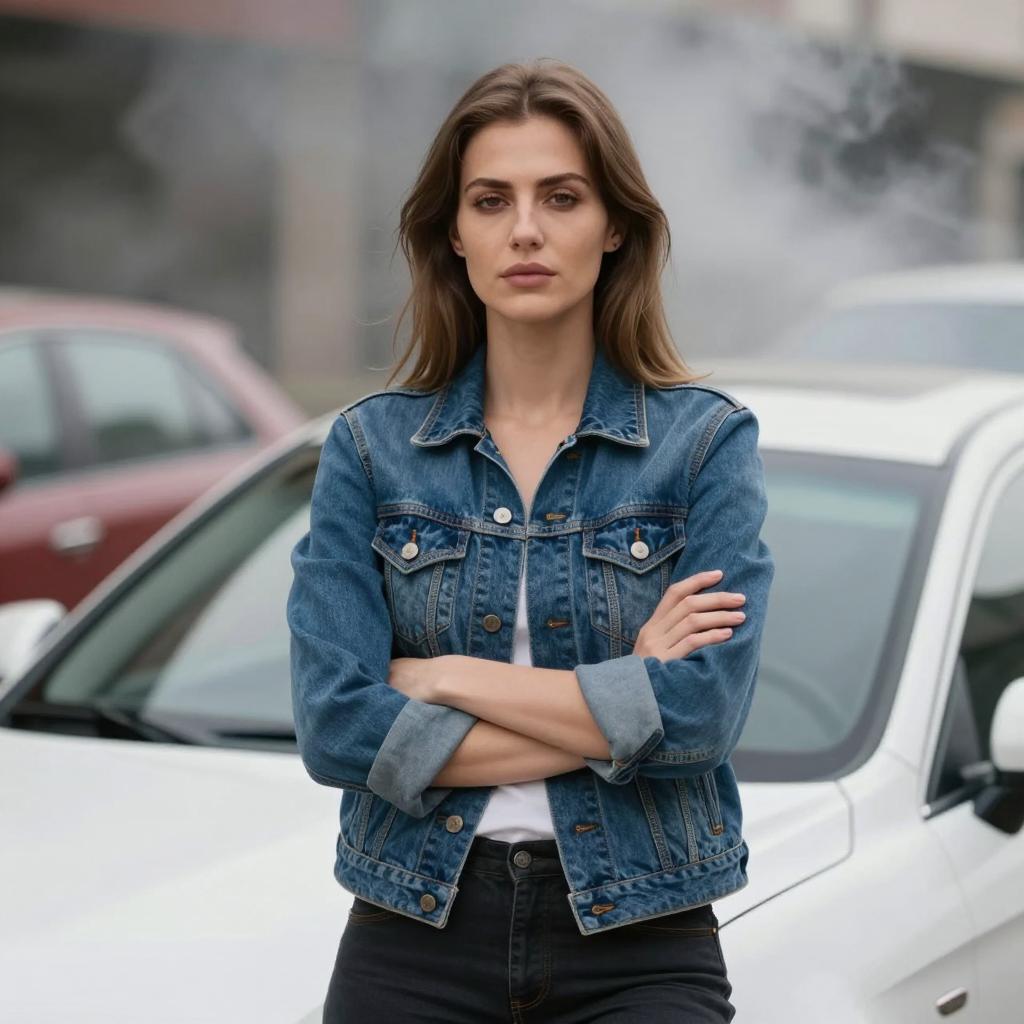 A woman with light brown, shoulder-length hair standing in front of a partially visible white car. She wears a dark blue denim jacket with rolled-up sleeves and dark pants. Her arms are crossed in front of her chest. Smoke or mist is in the background, partially obscuring a red and white object to the left. The woman's expression is neutral.
