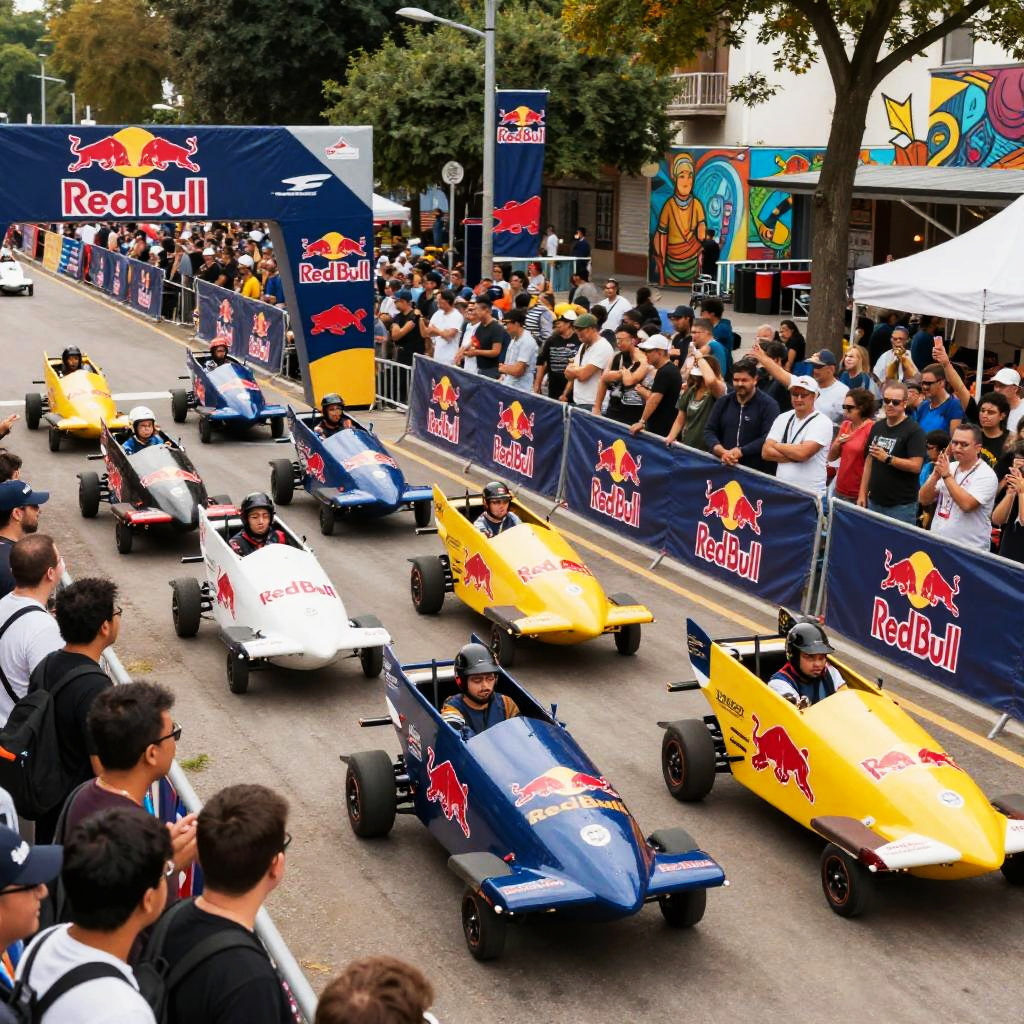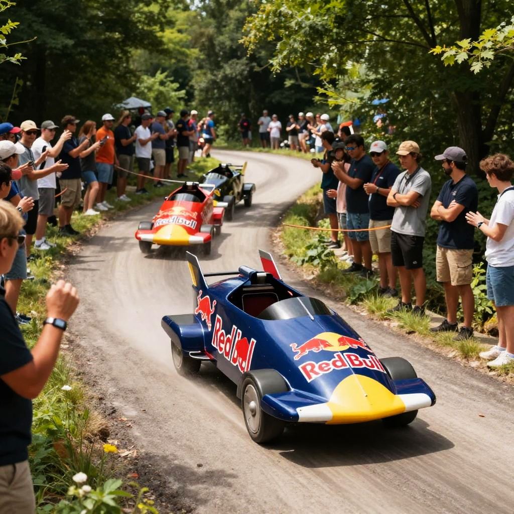 Redbull Soapbox Race featuring imaginative homemade soapbox vehicles shaped like futuristic machines, painted in bold colors, racing downhill on a winding road surrounded by cheering spectators, lush green trees on the sides, sunlight creating dramatic shadows.