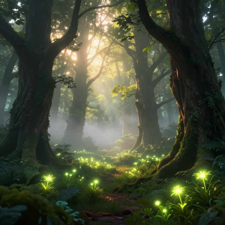 Newfound sense of wonder in a surreal forest at dawn, glowing plants and mist swirling around ancient trees, soft golden light filtering through leaves, dreamlike atmosphere, detailed fantasy landscape with vibrant colors