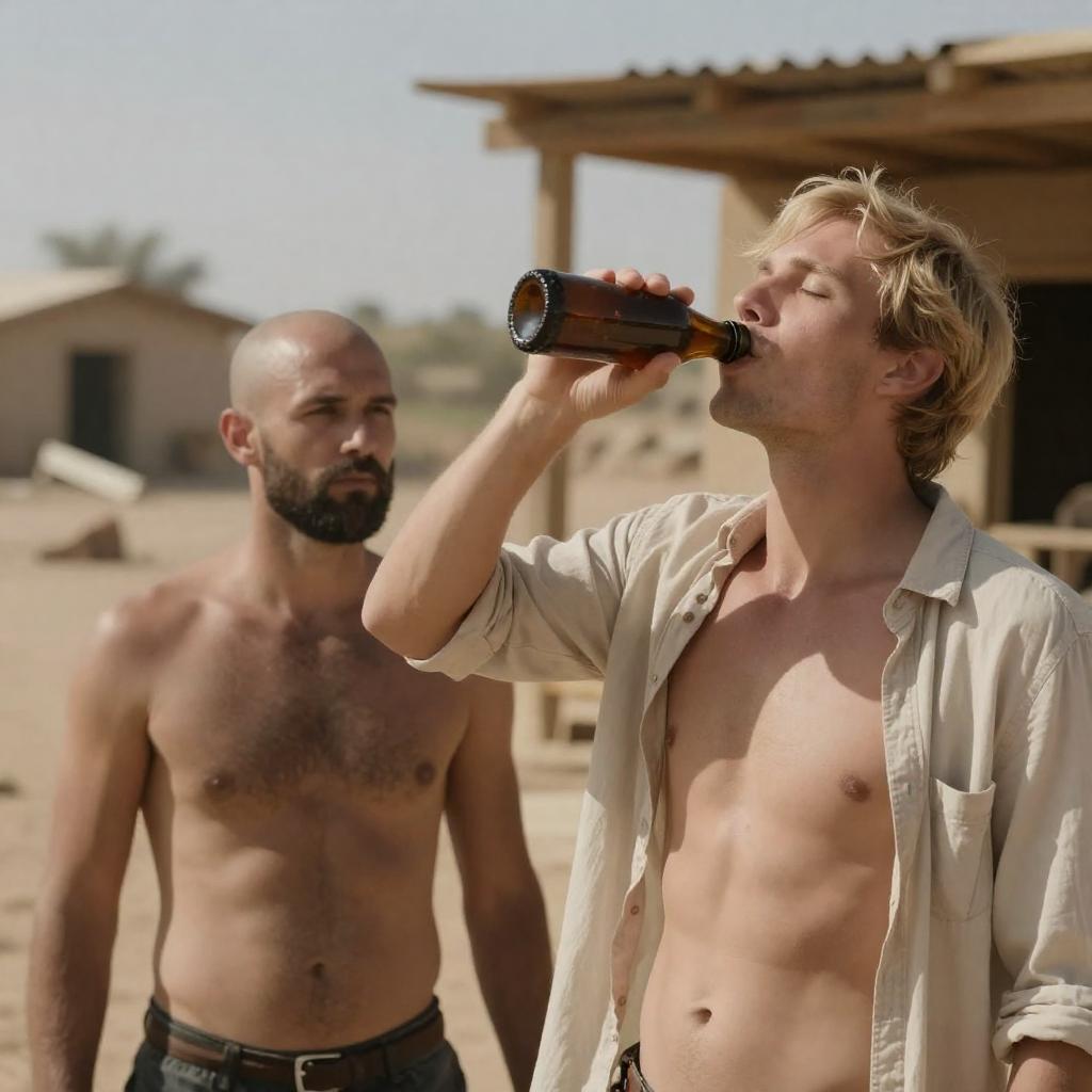 Photograph of two men in a desert-like setting. Shirtless bearded man with dark skin and muscular build holds a beer bottle, smiling. Blonde-haired man in unbuttoned light shirt with sunburned chest sits next to him, looking down. Rusty truck, wooden crates, and barren hills in background. Both men seated on ground.