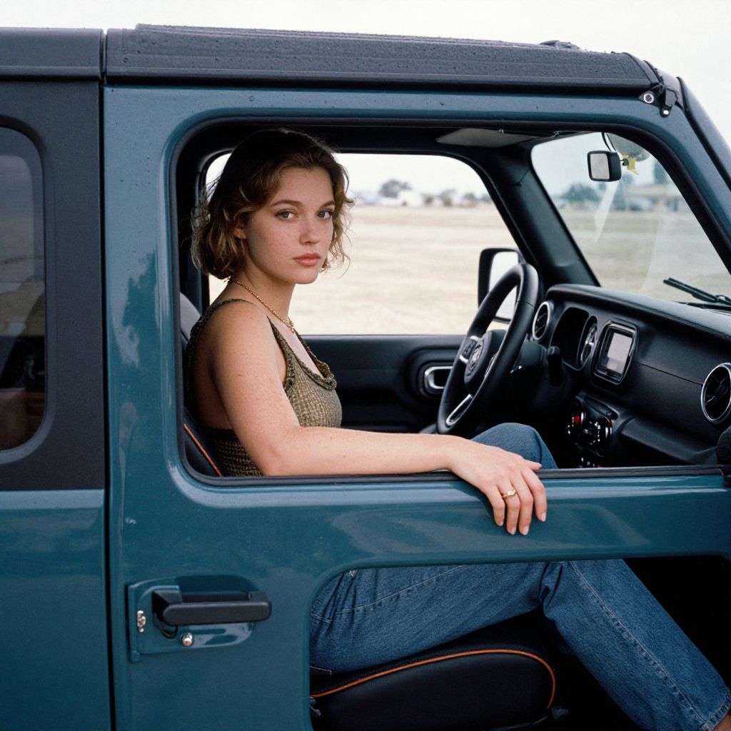 Renaissance beautiful woman sitting in the passenger seat of jeep wrangler + film grain, Leica 50mm, Kodak velvia,