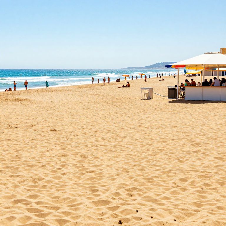 Estepona beach scene, golden sands stretching into the distance, families and surfers enjoying waves, modern beach bars with colorful umbrellas, bright clear sky, detailed sand textures and sparkling water reflections, vivid and lively summer atmosphere