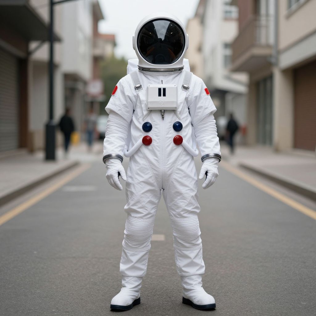 Photograph of a white astronaut suit with black helmet and visor, standing on an urban street, blurred buildings and people in background.