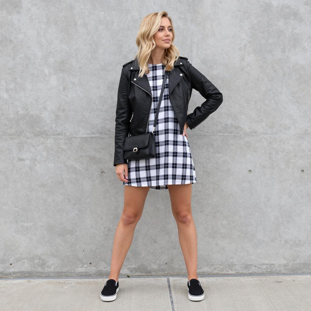 Blonde woman with long hair, wearing dark sunglasses, blue denim jacket, and cuffed jeans with "LA" and "NYCH" on cuffs. Sitting on stone steps, holding a brown patterned handbag. Wearing red pointed-toe shoes. Smiling. Outdoor setting.