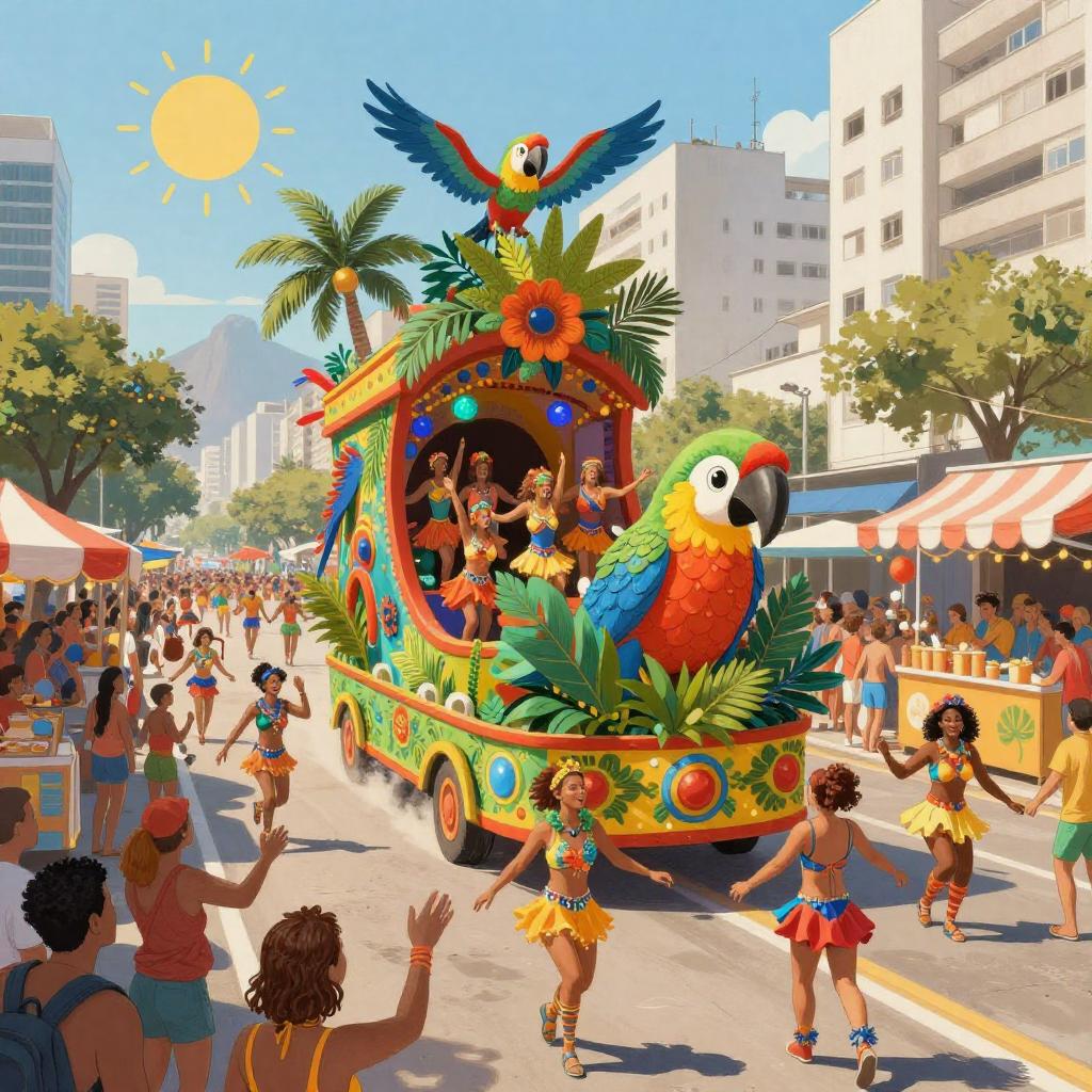 Hand-drawn vibrant illustration of a lively carnival parade in Rio de Janeiro featuring colorful tropical-themed floats with large parrots, dancers in bright costumes, bustling street food stalls with striped awnings, and a festive crowd under a sunny sky.