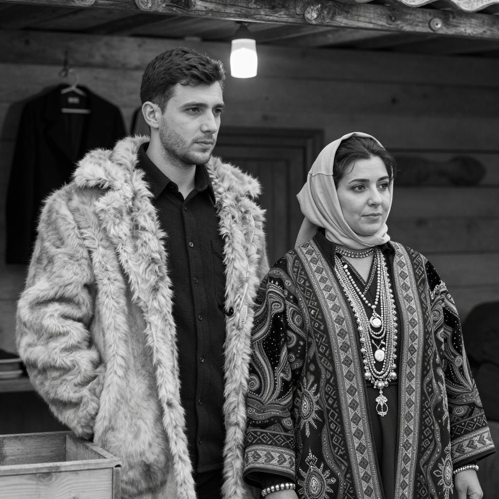 Black and white photograph of two people playing chess outdoors. Man on left with short blonde hair, smiling, wearing dark sweater. Woman on right with headscarf, serious expression, dark clothing. Chess pieces on wooden table in foreground. Tent and horse in background. Clear sky. Tree on right.