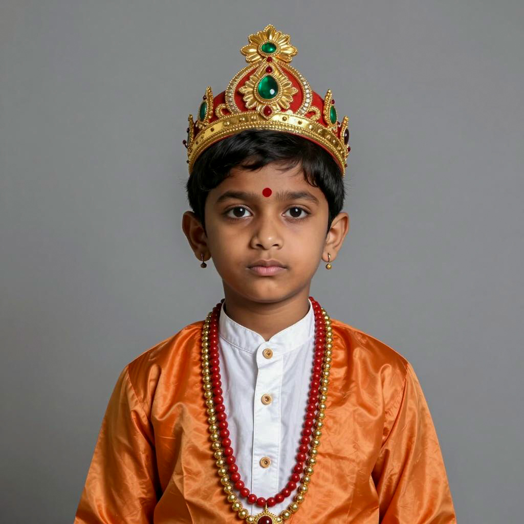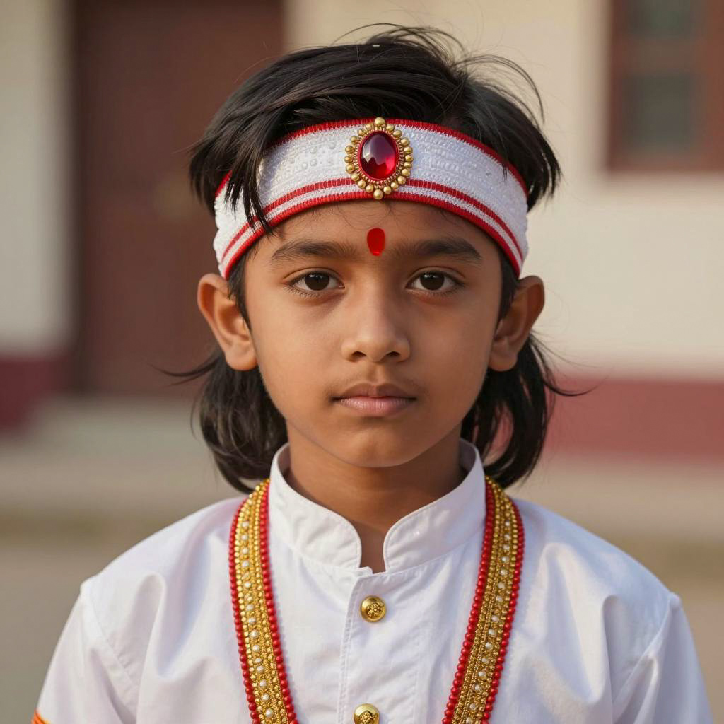 Asian indian halloween, photorealistic portrait of a young Asian boy, wearing traditional white outfit with gold buttons, red and gold necklaces, white and red headband with red gem centerpiece, long black hair, neutral expression, sunny outdoor background, slight blur on background, realistic ures, warm lighting, close-up shot, cultural attire, natural skin tone, detailed facial features, traditional headpiece