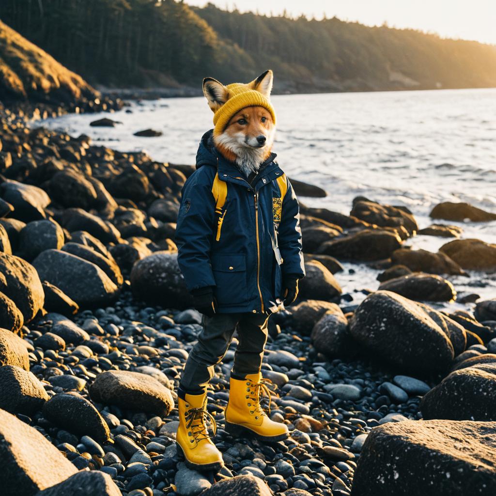A curious fox in a rocky shoreline during sunrise, wearing worn navy waterproof jacket with faded yellow rubber boots and a knitted gray beanie, captured in a cinematic wide shot with soft golden hour lighting and high-fidelity detail ––sref 1562