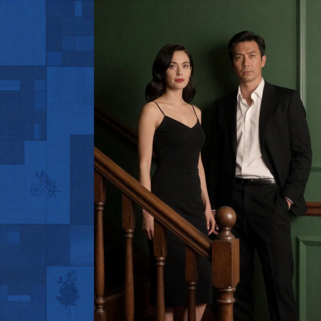 Photograph of a movie poster featuring a dark-haired woman in a black dress and a man in a black suit with a white shirt, standing in a dimly lit, green-paneled room. A wooden staircase is in the foreground. The poster includes vibrant and blue illustrations on the left.