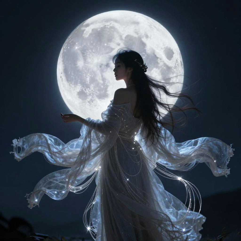 Silhouette of a woman with long flowing hair and a shimmering translucent linen dress, standing against a large full moon. The night sky casts a silvery blue glow, emphasizing the delicate threads on her dress, creating a magical and enchanted atmosphere.