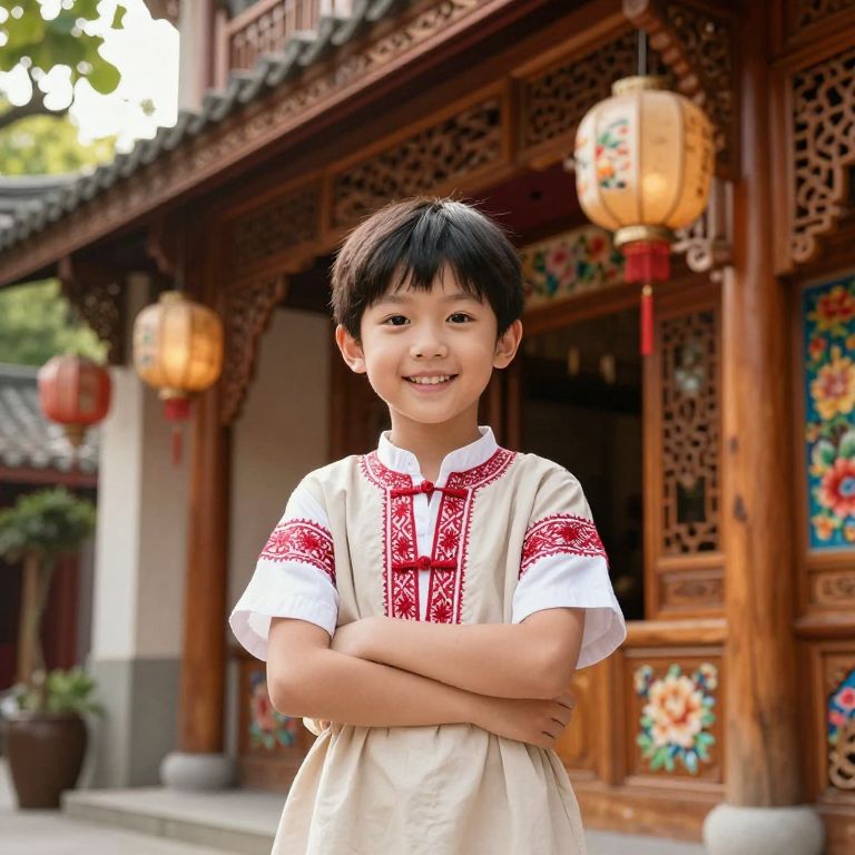 Photograph of a smiling young Asian boy with short black hair, standing outdoors in front of a traditional wooden building with intricate carvings and colorful floral patterns. He wears a white shirt with red embroidered details and a beige apron. His arms are crossed over his chest. Three ornate, glowing lanterns hang in the background, illuminated by sunlight. Potted plants are visible on the left. The scene is well-lit, emphasizing the rich textures and colors of the wooden architecture. The boy's bright eyes and cheerful expression add warmth to the image.