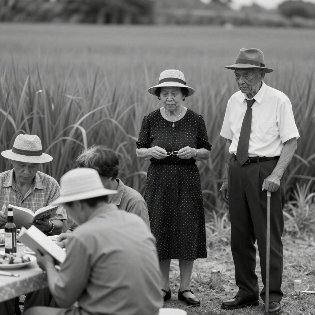 Black-and-white photograph of an elderly Asian woman with deep wrinkles, lying on gravel, wearing a sheer cloth, staring intently at a bowl of small objects on a flat surface. Background shows blurred figure sitting on gravel.