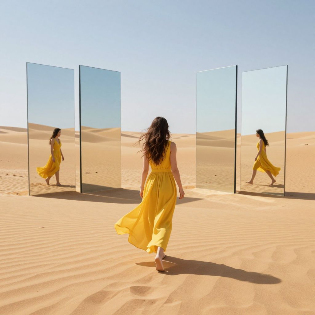 Photograph of a woman with long black hair in a flowing yellow dress, walking in a desert with four mirrored panels reflecting her image, under a clear