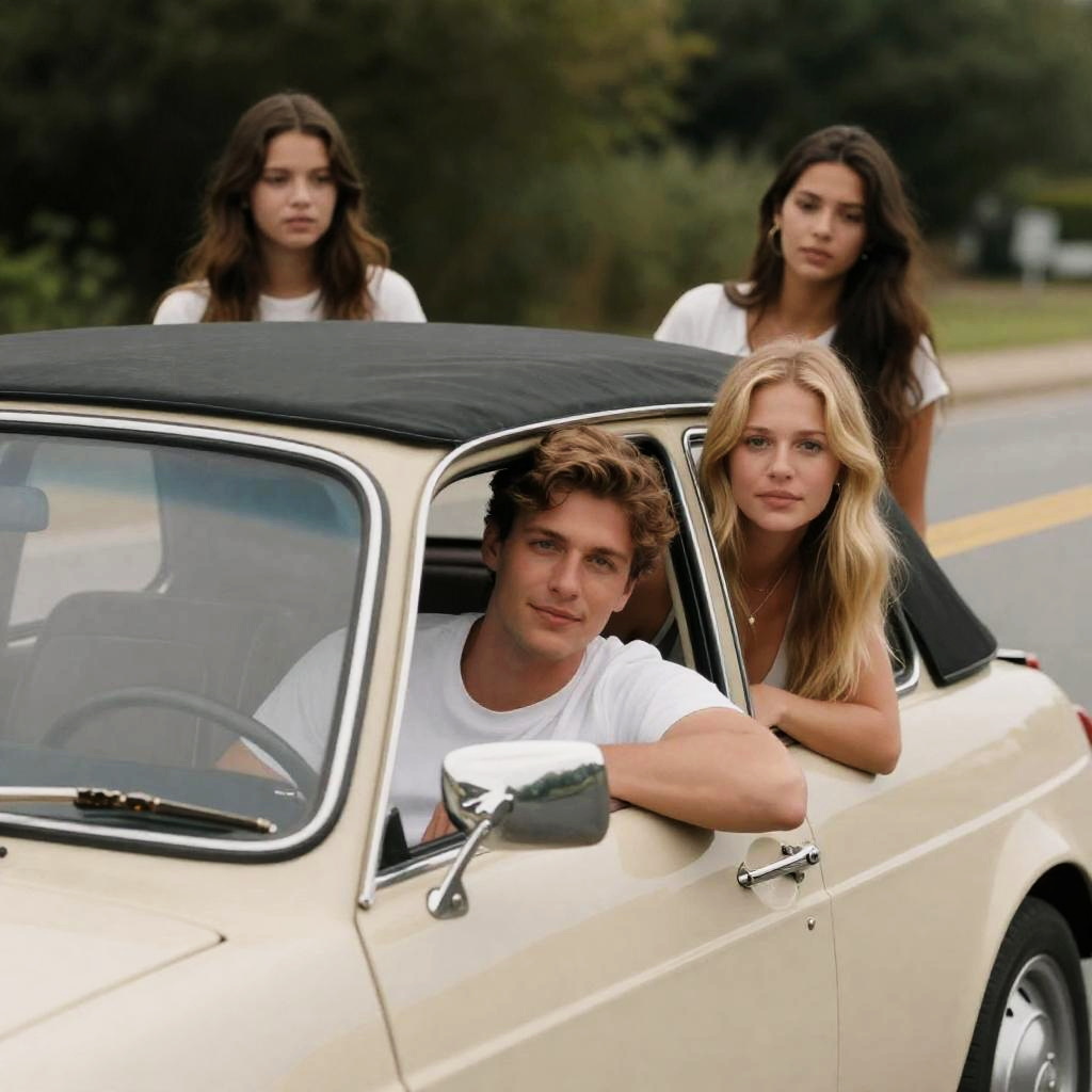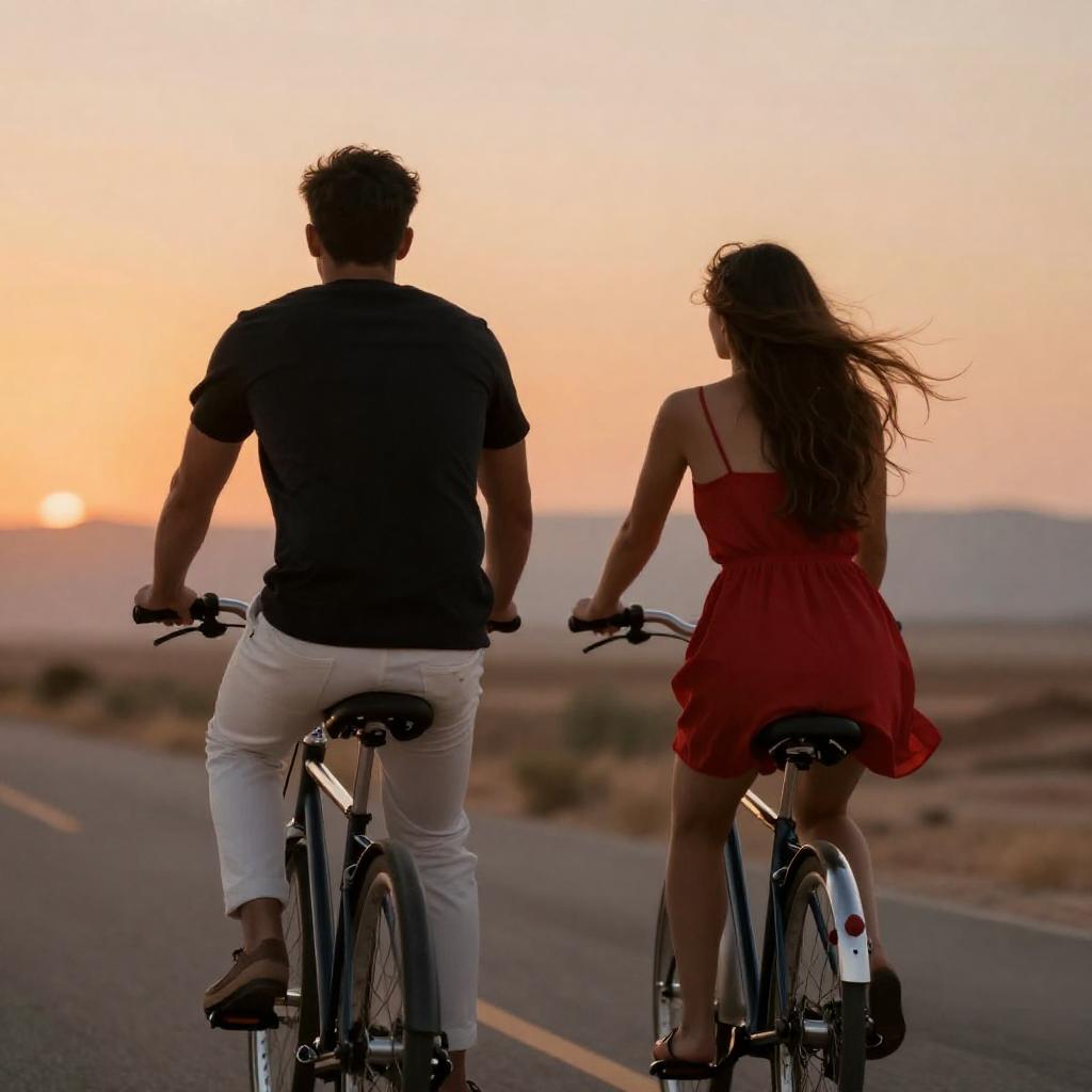 Photograph of a young couple and a dog on a gravel road in a field. The woman with long brown hair, wearing a floral shirt and denim shorts, rides a pink bicycle on the left. The man with short brown hair, wearing a white shirt and blue jeans, rides a red bicycle in the center. A golden retriever runs alongside the man, towards the camera. The background shows a wide, open field with a row of trees in the distance. Both people are smiling.