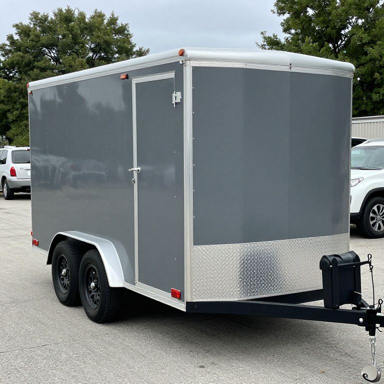 Stationary 2021 Haulmark 6x12 enclosed cargo trailer showcasing a sleek gray exterior, dual rear wheels, diamond plate lower panel, and a hitch assembly with safety chains, positioned outdoors on a paved lot surrounded by other vehicles and trees.
