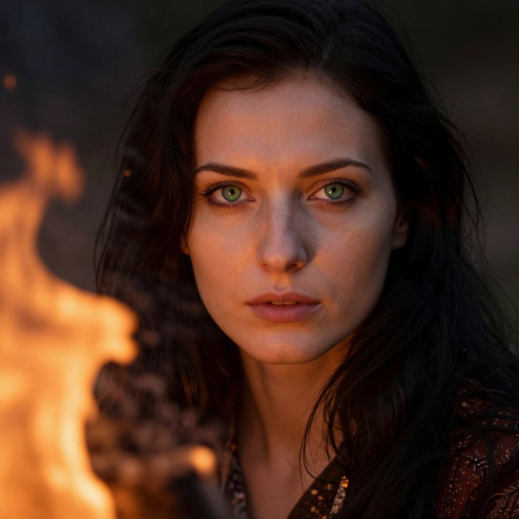 Imagine a portrait photograph capturing the enigmatic gaze of an Eastern European woman. Her captivating green eyes, framed by long, dark hair, hold a steady focus. The scene is illuminated by the warm glow of a flickering fire, its dancing flames casting dramatic shadows across her serene face and accentuating the intricate details of her porcelain skin. From a unique 'worm's-eye view', this striking composition emphasizes the depth and beauty within her expression, inviting introspection and conveying a sense of resilience amidst the grandeur of nature.