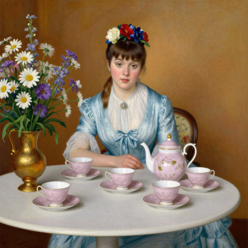 Photograph-style digital illustration of a Victorian-era woman with fair skin and dark brown hair adorned with a colorful floral hairpiece. She wears a light blue, high-collared, ruffled dress with a white bow at the neck. She sits at a round table covered with a white cloth, sipping from a pink and white patterned teacup with a matching saucer. The table also has four more matching teacups, saucers, and a white teapot with pink and yellow floral designs. A golden vase with a bouquet of white, yellow, and purple daisies sits on the left side of the table. The background is a simple brown wall.