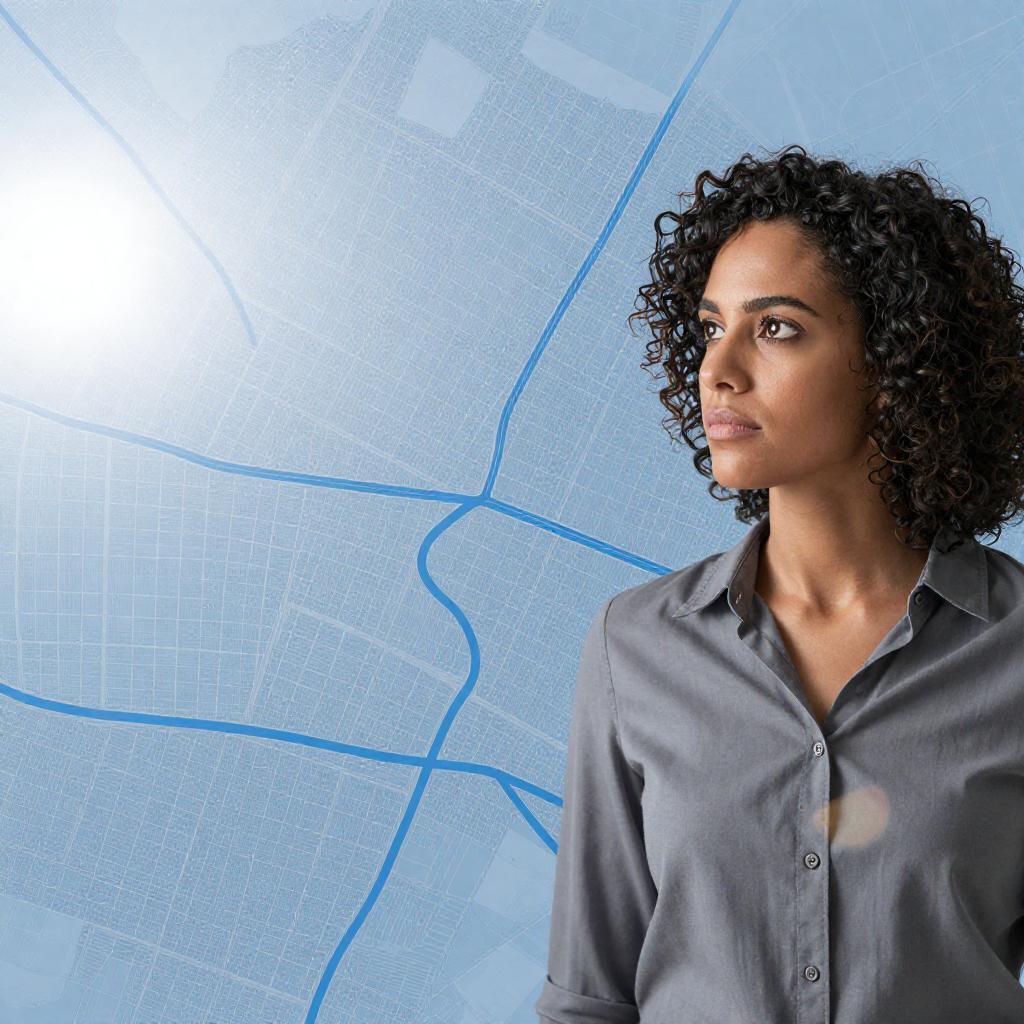 Photograph of a woman with curly black hair, wearing a gray button-up shirt, gazing intensely at a blue, grid-like city map overlay. She stands to the right, with the map covering most of the background. Blue city street names and grid lines overlay the map. Bright light and lens flare effect in the background.