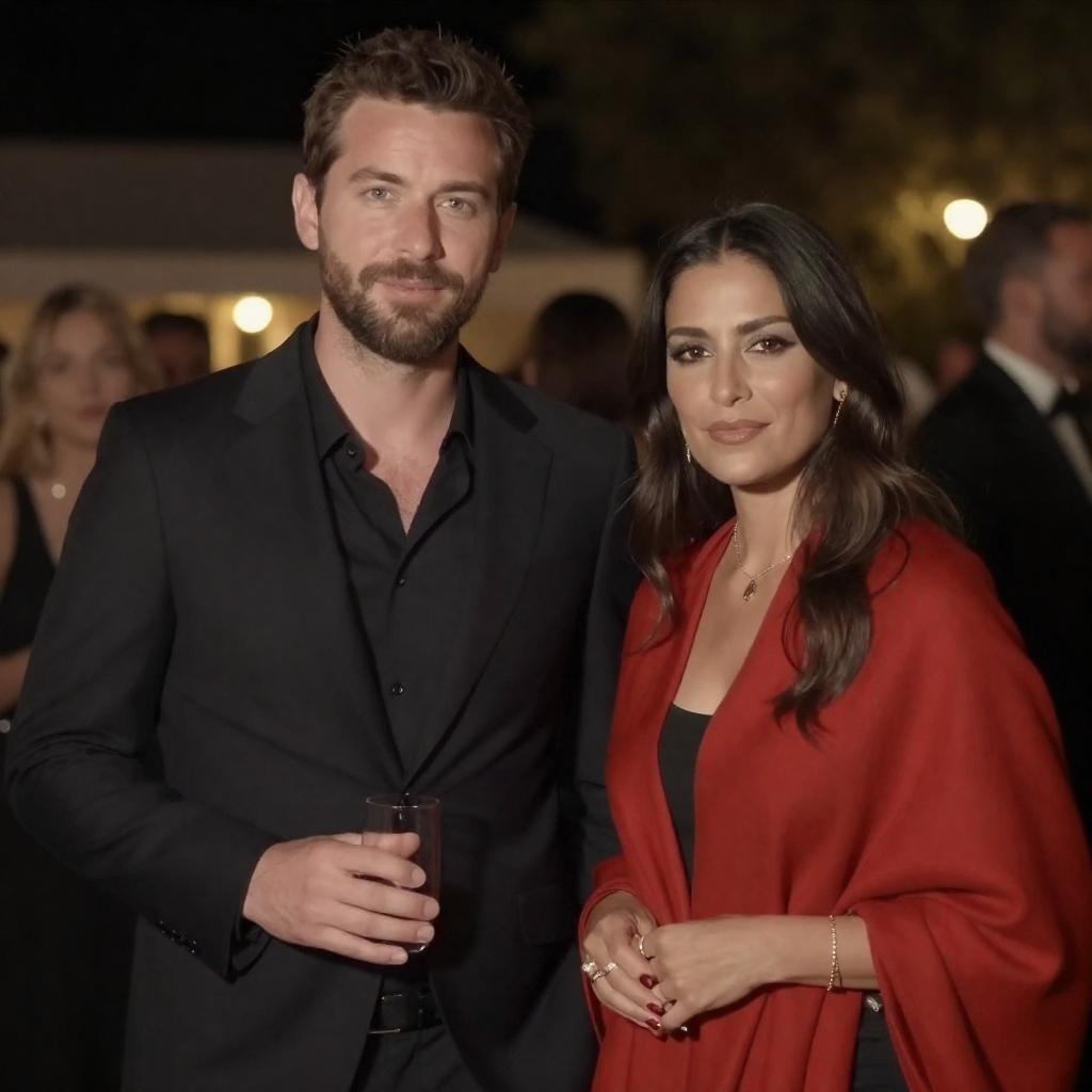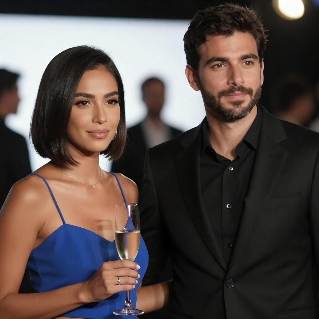 Photograph of a man and woman standing close together. The man, with dark hair and beard, wears a white suit and black sunglasses. The woman, with long dark hair and red lipstick, wears a sleeveless brown leopard-print dress. They both hold glasses and stand in front of a dark, ured background.
