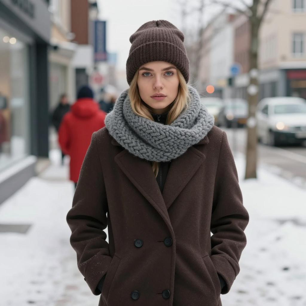 Winter casual outfit woman, photograph of young woman standing on a snowy urban street, winter clothing, brown knit beanie, large chunky gray scarf, dark brown coat, hands in coat pockets, serious expression, blonde hair, blue eyes, blurred background, red jacket on person in background, storefronts with glass windows, daytime, overcast light, cityscape, realistic style, focus on subject, bokeh effect in background