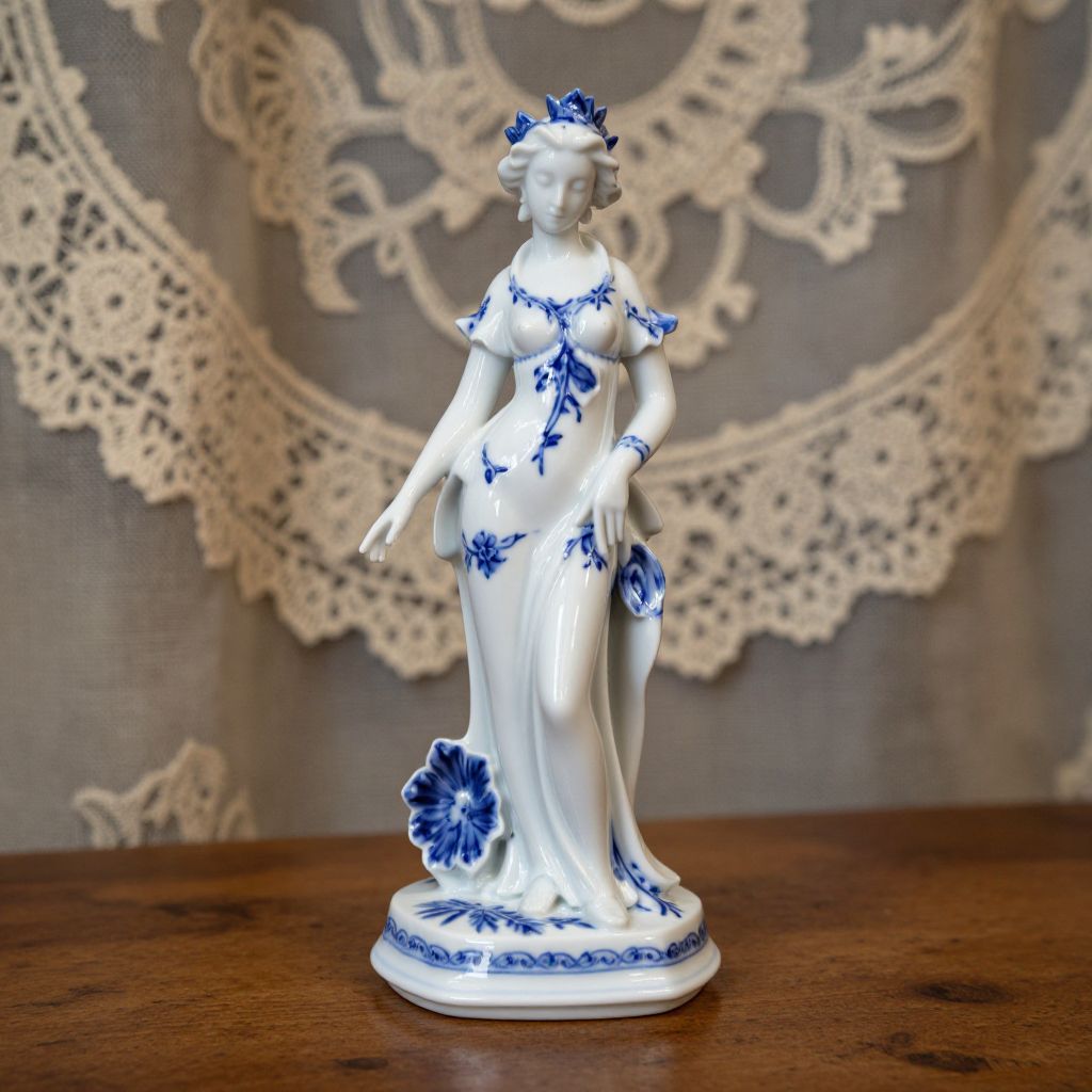 Porceline figurine elegantly crafted in delicate white ceramic with intricate floral blue patterns, soft lighting highlighting the glossy finish, placed on an antique wooden table with a vintage lace curtain backdrop, high resolution.