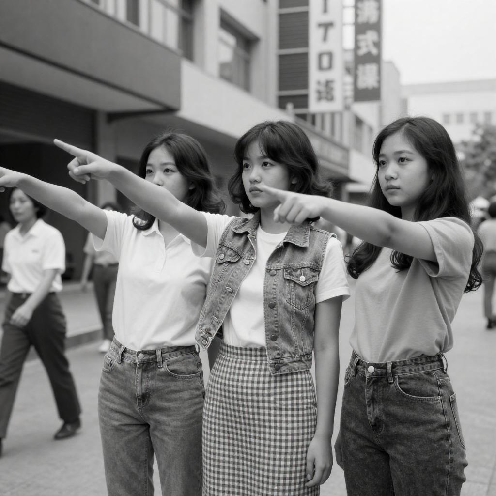 Black and white photograph of two young Asian women walking side by side on a city sidewalk. Both wear striped t-shirts, high-waisted denim shorts, and baseball caps. One woman is focused on her smartphone while the other looks ahead. Background features parked cars, buildings, and a man walking away in casual clothing.