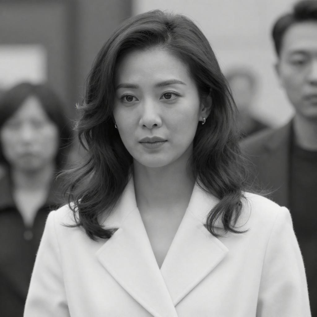 Black and white photograph of a woman with wavy, shoulder-length hair, wearing a white coat, looking slightly to the side with a neutral expression. Background is blurred with indistinct objects. Partially visible man on the right.