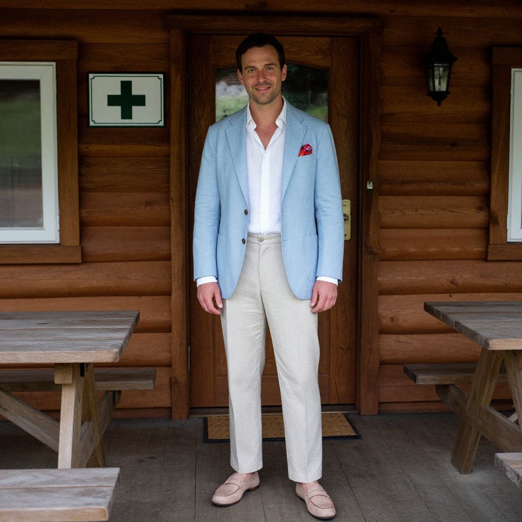 A man, lightweight pastel blazer, crisp white linen shirt, tailored beige trousers, soft leather loafers, vibrant silk pocket square, wooden cabin, first aid sign above door, picnic tables nearby, anscochrome analog film, relaxed smile, confident demeanor. Man has masculine face and piercing eyes