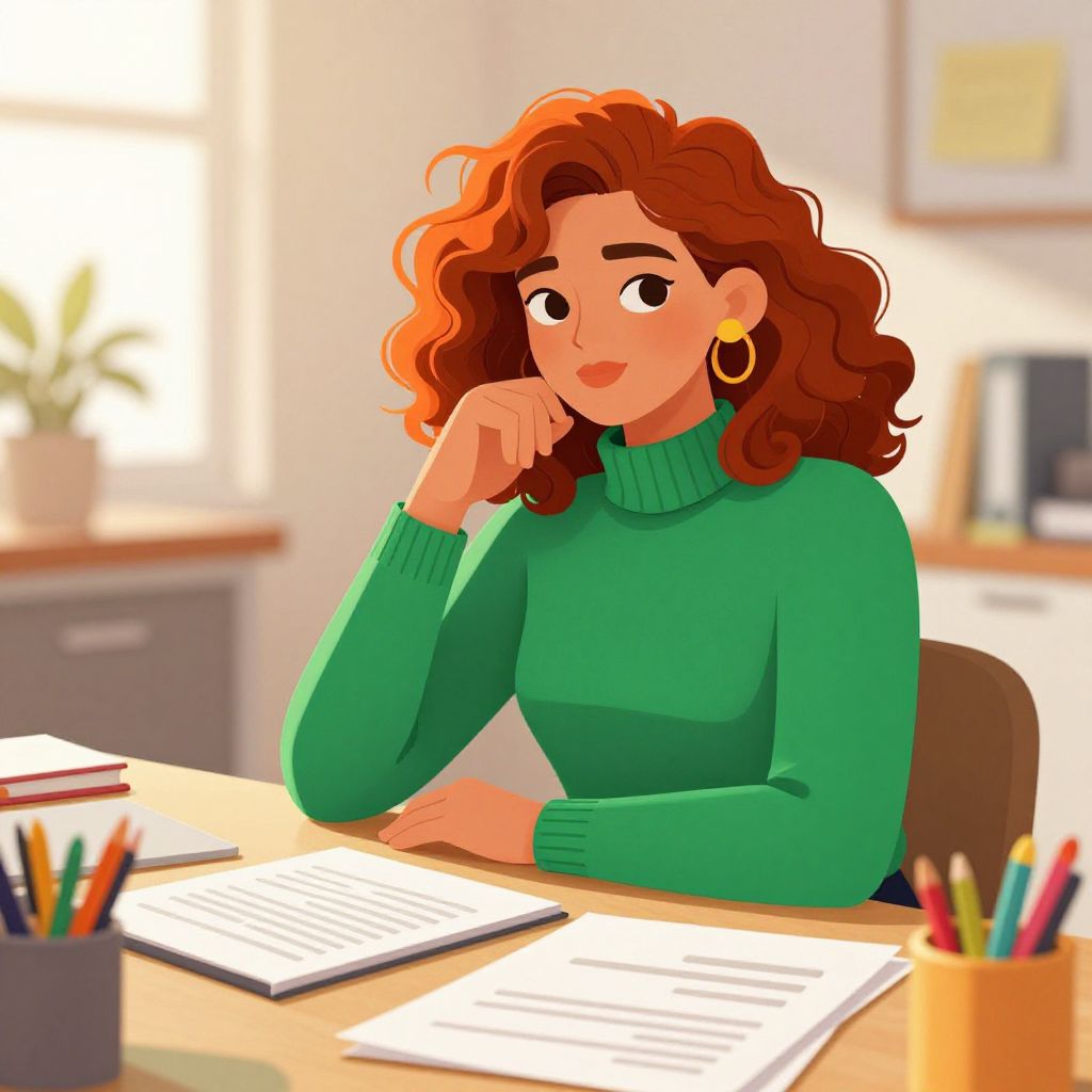 A vibrant digital illustration of a woman with curly red hair, seated at a desk adorned with papers and colorful stationery. She wears a stylish green turtleneck, exuding creativity and confidence in a warm, sunlit office space.