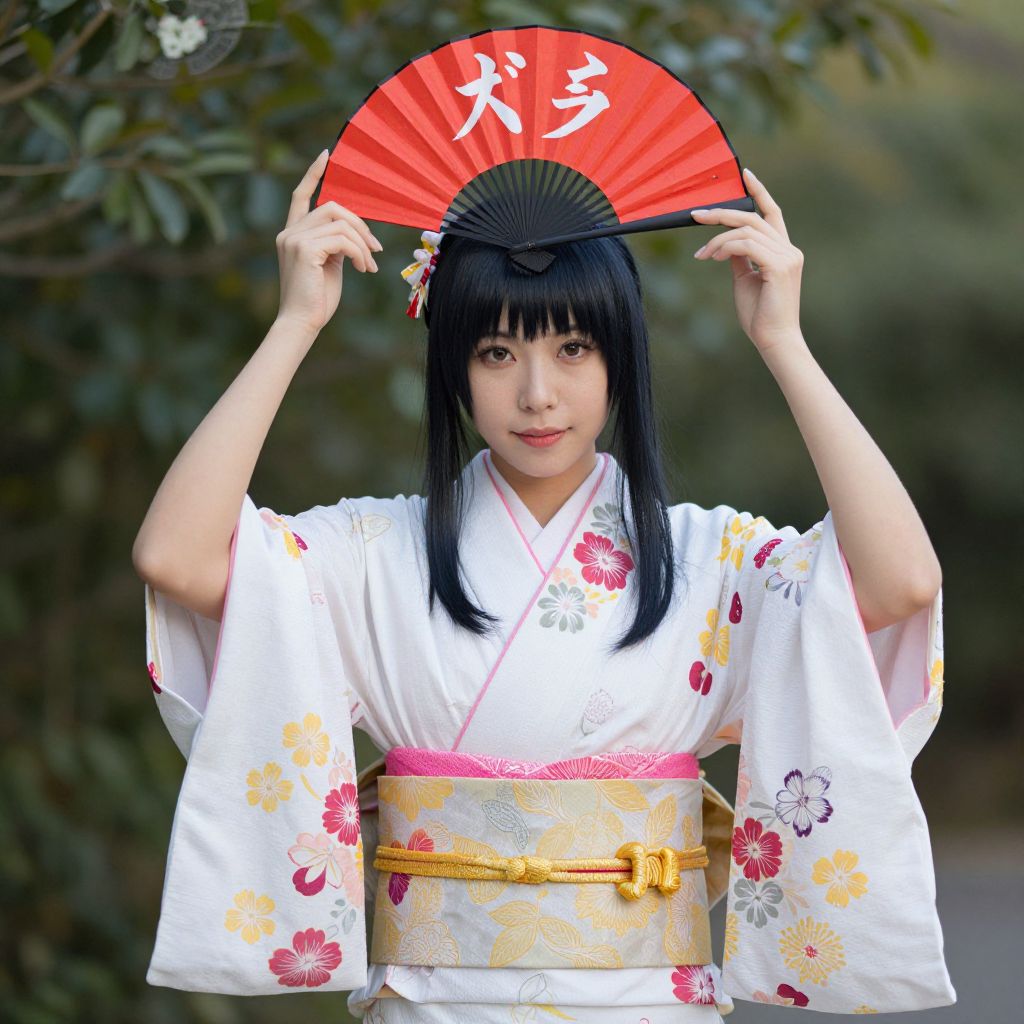 Photograph of an Asian woman with black hair, wearing a white floral kimono, holding a red folding fan with white Japanese characters, outdoors with green