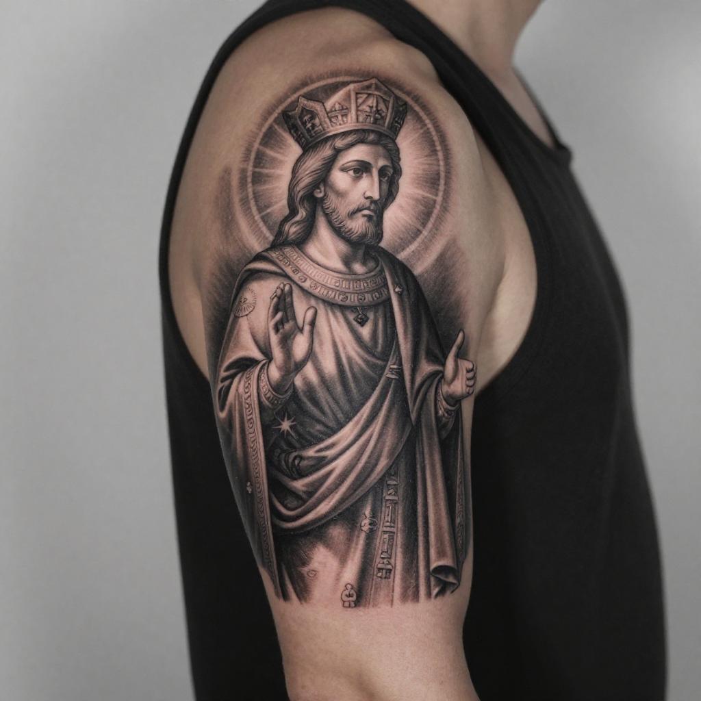 Saint symbol tattoo rendered in black and gray realism style, detailed shading highlighting ancient religious motifs, placed on upper arm with soft background shadows creating divine aura.