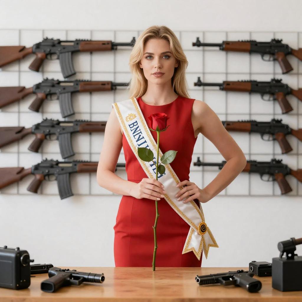 Blonde woman in red dress with sash, standing in armory, holding rose. Background: wall of guns on grid. Table with guns and accessories in foreground. Confident pose, intense gaze. Guns vary, rifles and handguns. Bright, well-lit setting.