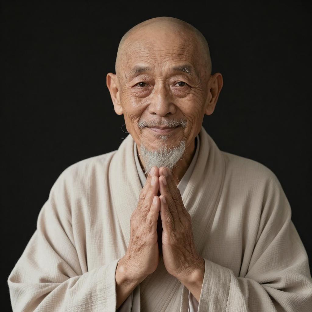1boy, male focus, solo, black background, bald, realistic, own hands together, old, looking at viewer, simple background, old man, upper body, smile, wrinkled skin, palms together, facial hair, robe