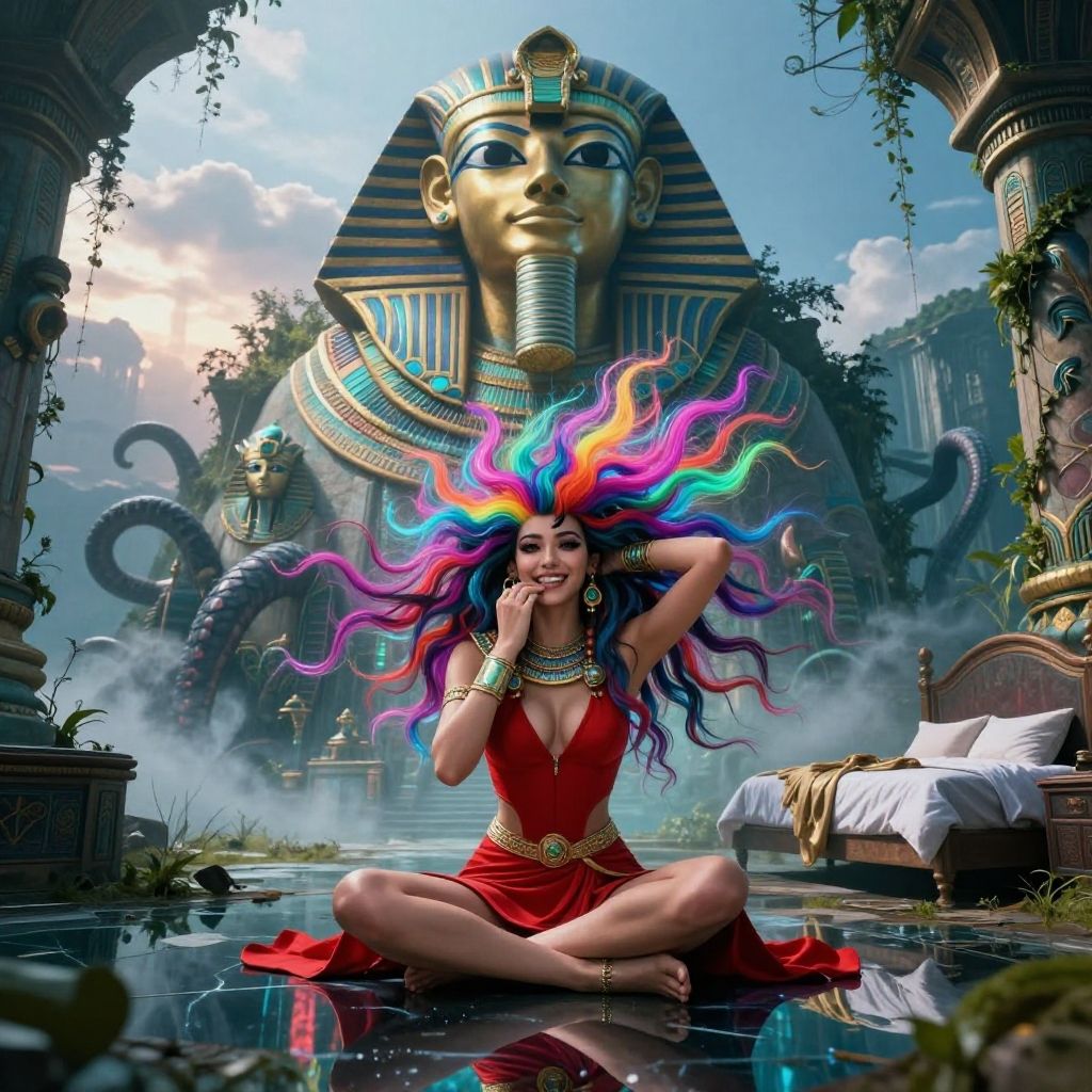 Highly insanely detailed, masterpiece, top quality, best quality, highres, 4k, 8k, RAW photo, ((ancient egyptian theme:1.2)), Hong Kong structure, building, structure, taiwan, korean, swirling energy, tentacle, (underwater), reflection, reflective floor, abandoned building, overgrown with vegetation, [volumetric fog], cinematic lighting, colorful, colourful, (long_hair, long hair, random colors hair, glowing hair, hair over one eye, long messy hair), (eyelashes, eyeliner, eyeshadow, eyelashes, long eyelashes), collar, earrings, jewelry, necklace, armlet, nsfw, cleavage, perfect body, makeup, action pose, drunk, biting, dawn, 1girl, solo, sitting, hitomitono, looking at viewer, seiza, arms behind head, smile, red vest, bed, bedroom, skirt, long sleeves