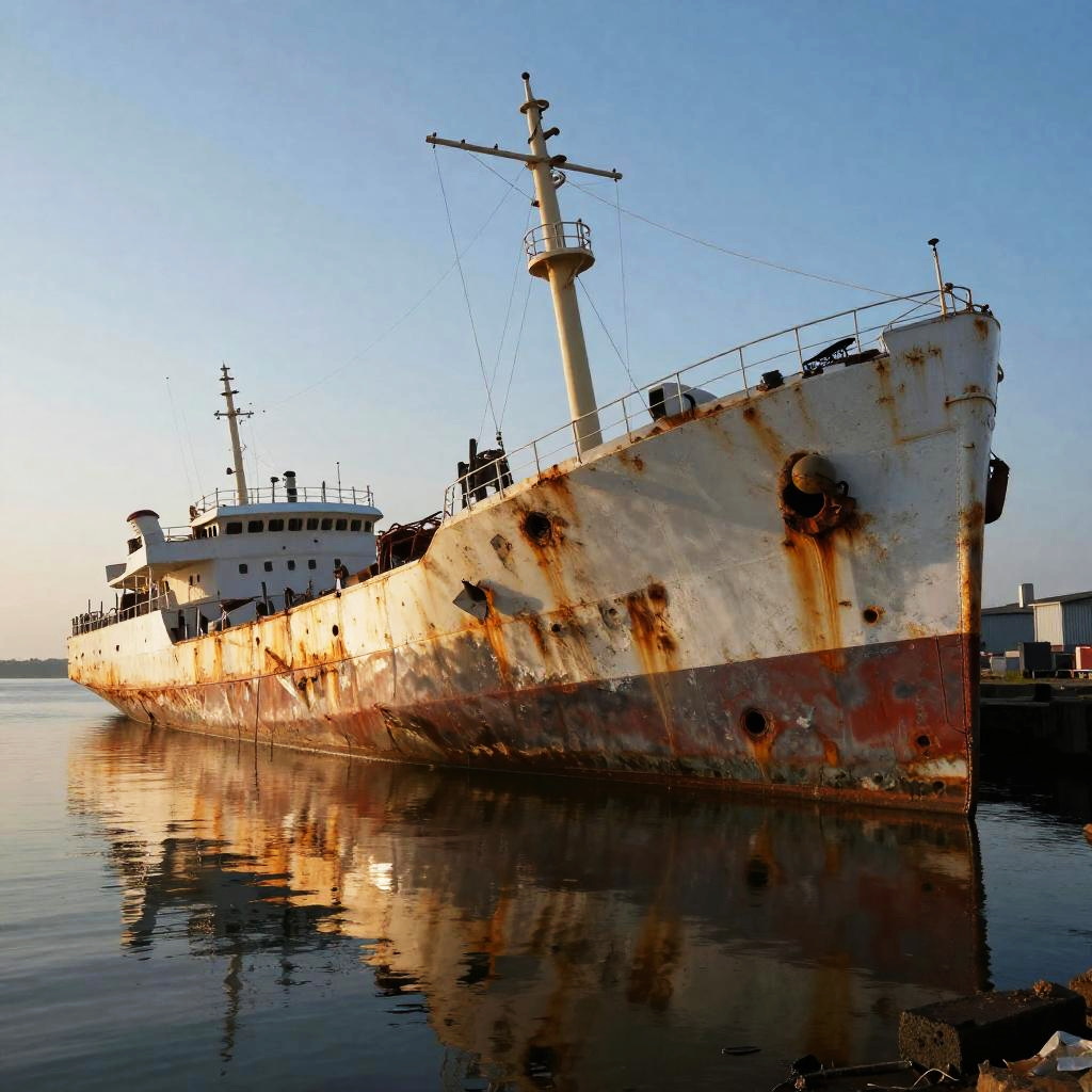 Photograph of a rusted, abandoned ship with peeling paint, anchored in calm water at sunset, reflecting its weathered hull and mast.