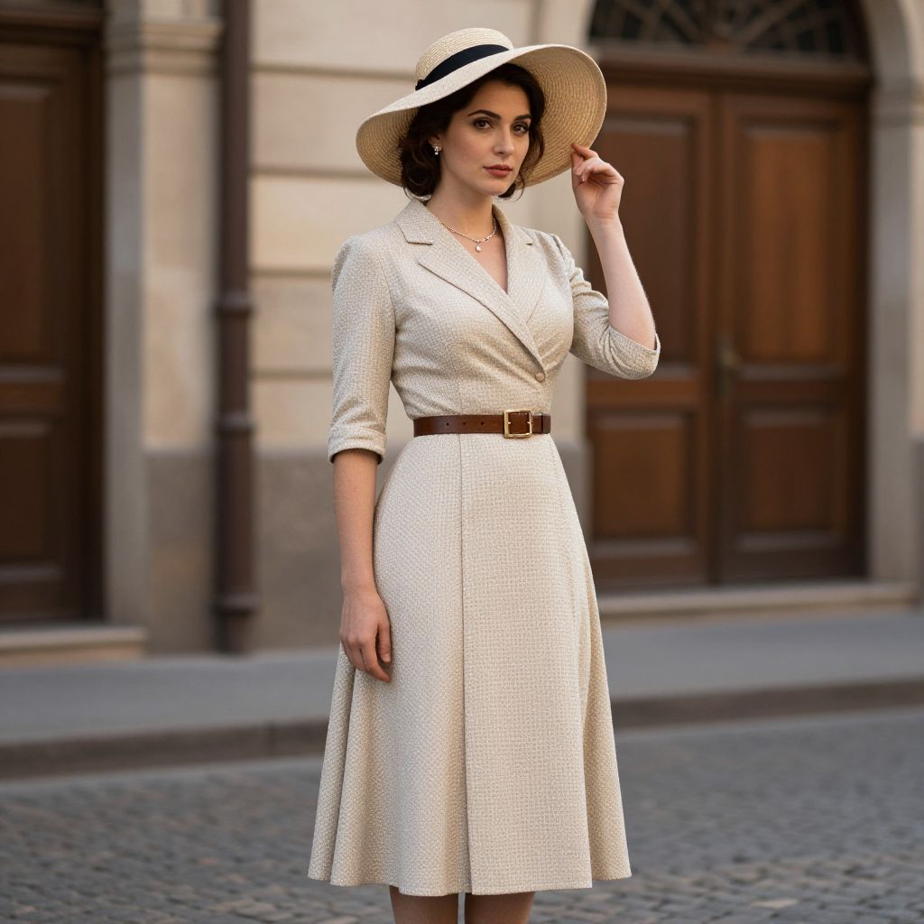 Photograph of a fair-skinned woman with dark brown hair, wearing a wide-brimmed, beige straw hat with a black band. She is dressed in a cream-colored, textured, knee-length coat dress with three-quarter sleeves, and a brown leather belt. The background features a cobblestone street with a beige stone building and large, dark wooden double doors. She stands confidently, adjusting her hat with her right hand, and gazes forward with a composed expression. The lighting is natural, highlighting the texture of her dress and the smoothness of her skin.