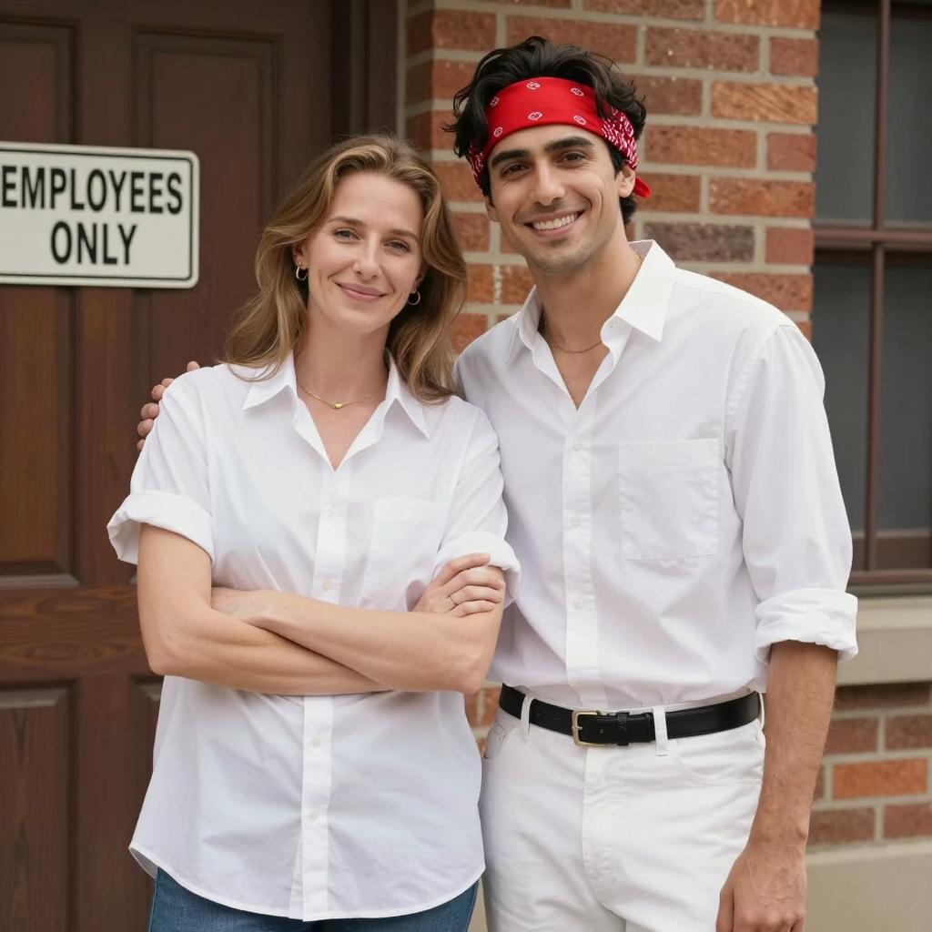Photograph of a man and woman sitting inside an orange tent. The woman, with fair skin and brown hair, wears a patterned shirt and smiles slightly. The man, with medium skin and dark curly hair, wears sunglasses and a white t-shirt with "The Day of the Dead" . They are covered with a red blanket.