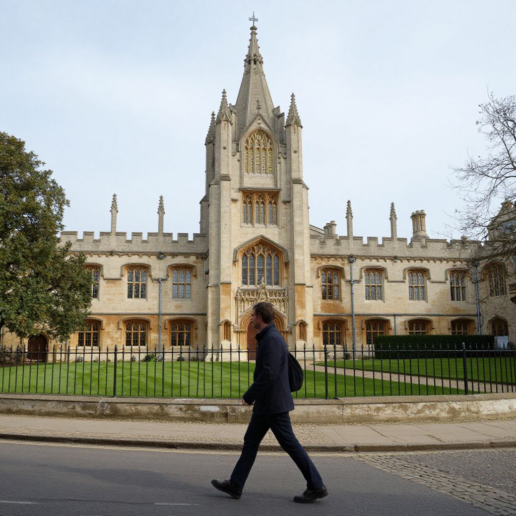 Photograph of a Gothic-style university building with pointed arches, intricate stone carvings, and tall, narrow windows. The building is light beige with dark green accents. In the foreground, a person with curly brown hair, wearing a black coat and pants, walks across a paved street. A black iron fence separates the street from a well-manicured green lawn. Trees with green leaves flank the left and right sides of the building. The sky is clear and bright, suggesting daytime. The overall scene conveys a serene, academic atmosphere.